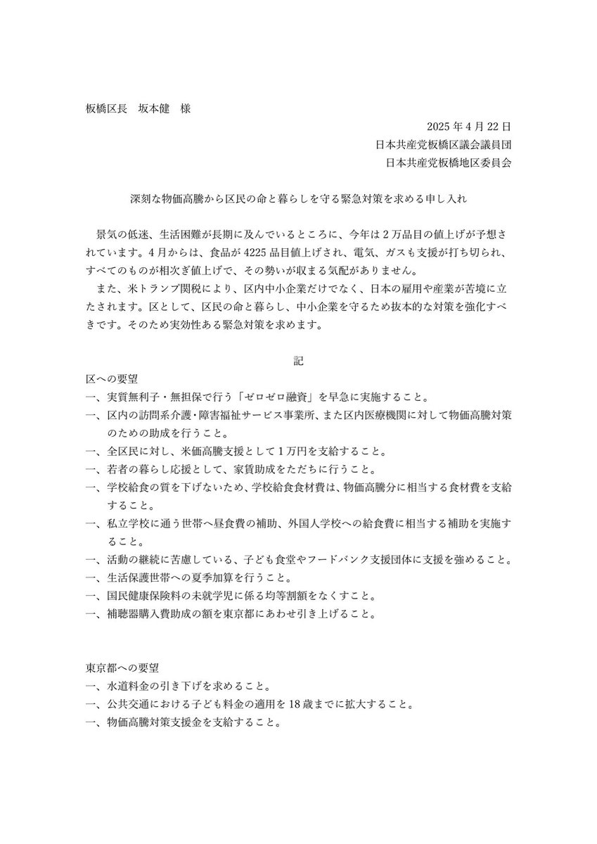「深刻な物価高騰から区民の命と暮らしを守る緊急対策を求める申し入れ」を行いました。