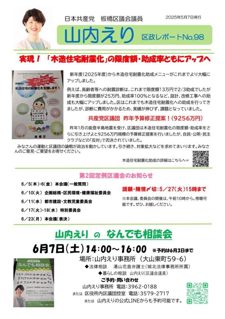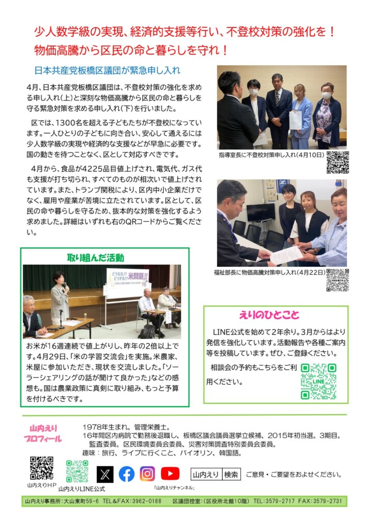 区政レポートNo.105を発行しました! 〇板橋駅西口駅前広場 住民の待ったに応えよ! 〇山内えりのなんでも相談会 ・11月15日(土)13:30~ ・12月20日(土)13:00~ 〇地域経済を下支えする中小企業へ直 ...