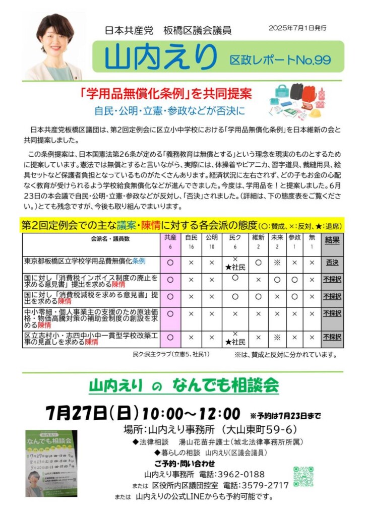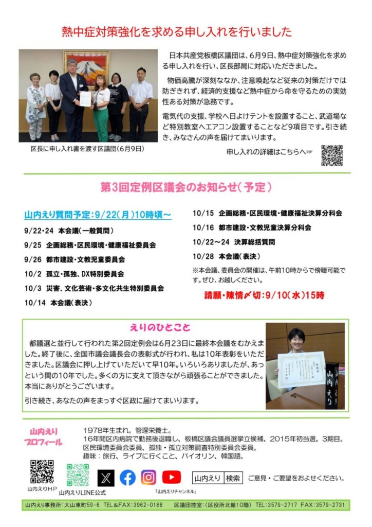 なお、9/22(月)午前10時から区議団を代表し、一般質問を行います。