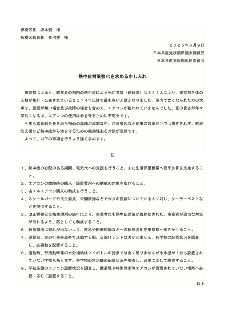 本日、共産党板橋区議団は、熱中症対策強化を求める申し入れを行い、区長部局に対応いただきました。