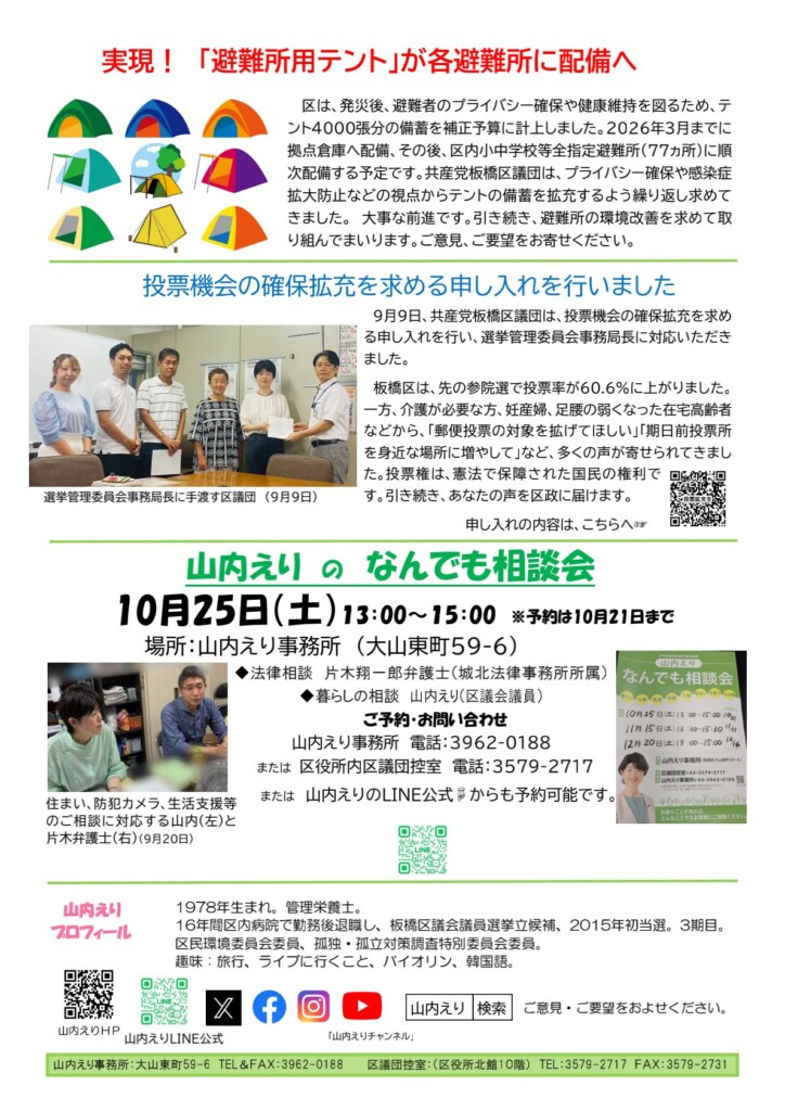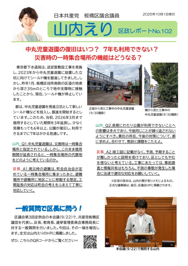 区政レポートNo.105を発行しました! 〇板橋駅西口駅前広場 住民の待ったに応えよ! 〇山内えりのなんでも相談会 ・11月15日(土)13:30~ ・12月20日(土)13:00~ 〇地域経済を下支えする中小企業へ直 ...
