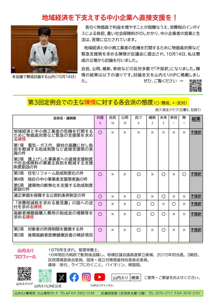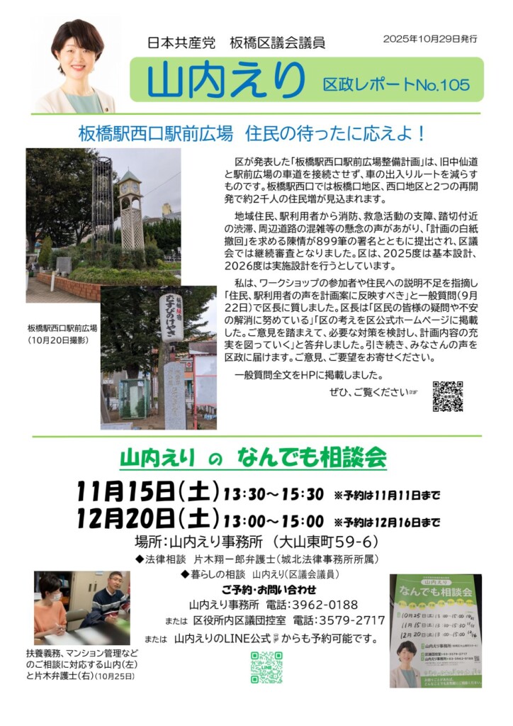 区政レポートNo.105を発行しました! 〇板橋駅西口駅前広場 住民の待ったに応えよ! 〇山内えりのなんでも相談会 ・11月15日(土)13:30~ ・12月20日(土)13:00~ 〇地域経済を下支えする中小企業へ直 ...