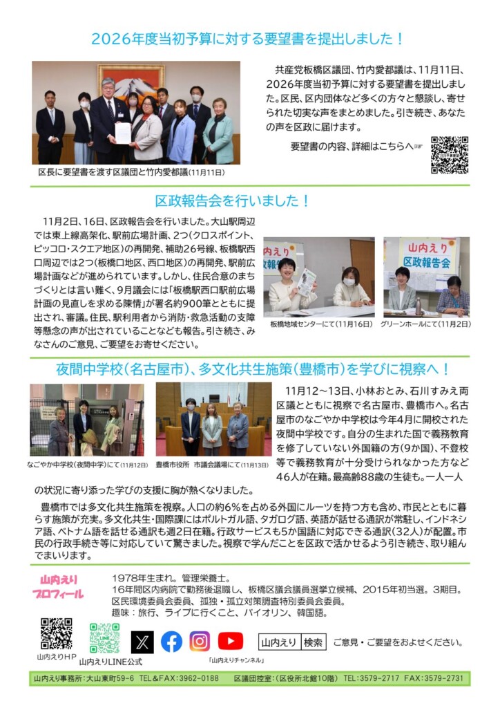 区政レポートNo.105を発行しました! 〇板橋駅西口駅前広場 住民の待ったに応えよ! 〇山内えりのなんでも相談会 ・11月15日(土)13:30~ ・12月20日(土)13:00~ 〇地域経済を下支えする中小企業へ直 ...