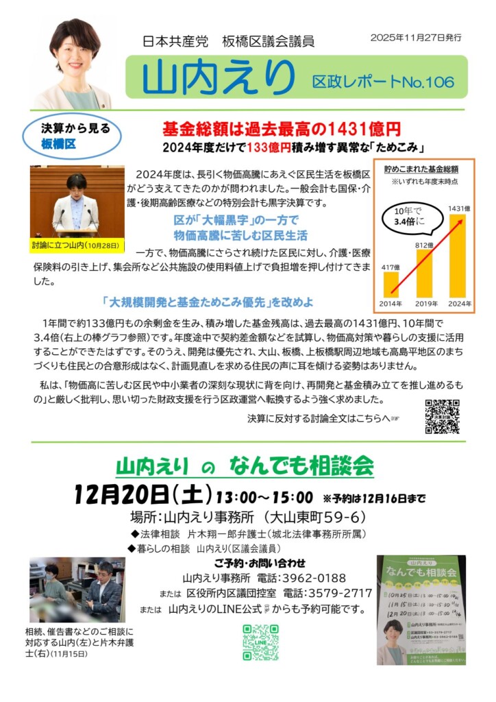 区政レポートNo.106を発行しました。 〇決算から見る板橋区 基金総額は過去最高の1431億円 2024年度だけで133億円積み増す異常な「ためこみ」 〇山内えりのなんでも相談会 12/20(土)13:00~ 〇202 ...