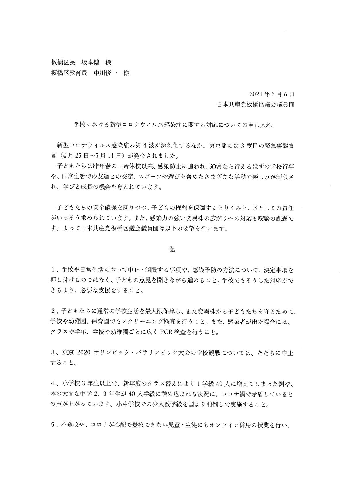区議団は、5月6日、教育長に対し、申し入れを行いました。