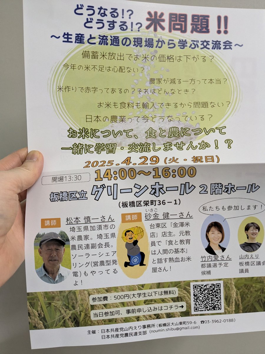 4/29(火)の米問題を学ぶ交流会のご案内など配布。