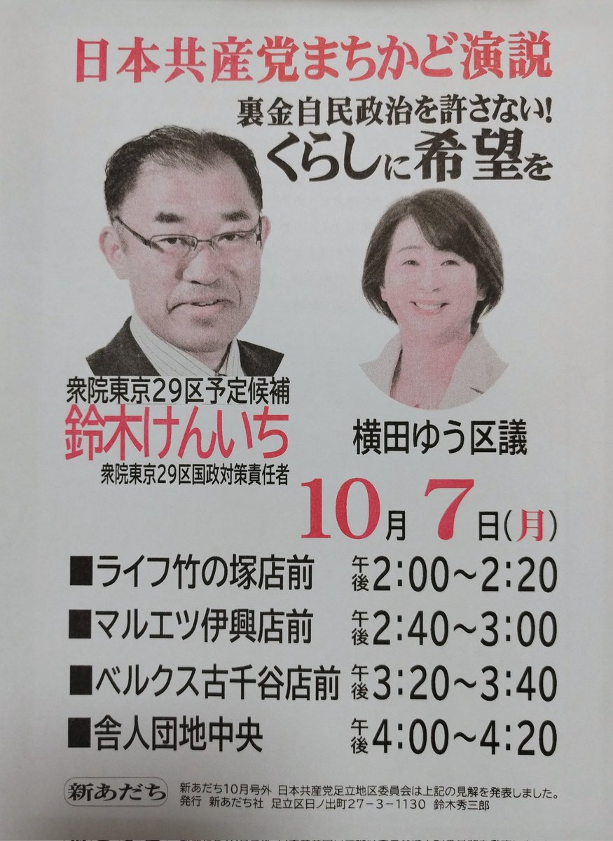 衆議院東京29区予定候補鈴木けんいちさんが足立区にやってきます。ぜひ聞きに来てください。