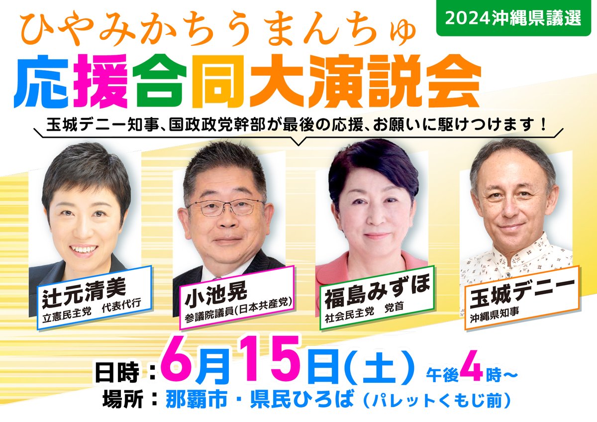 RT @jcp_okinawa: 明日(15日)3政党+知事の合同街宣を中継予定です。